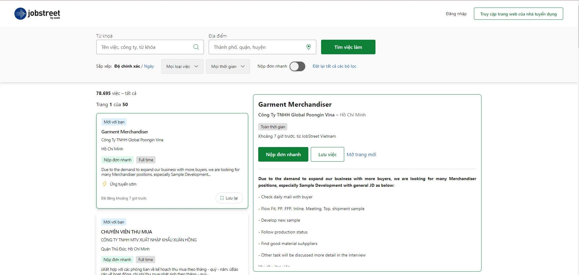 Jobstreet is a leading job board in Southeast Asia, including Vietnam. It offers a wide range of job listings across various industries. Jobstreet provides recruiters with tools to post job ads, manage applications, and search for candidates. The platform’s user-friendly interface and extensive reach make it a popular choice for recruiters looking to fill positions quickly and efficiently.