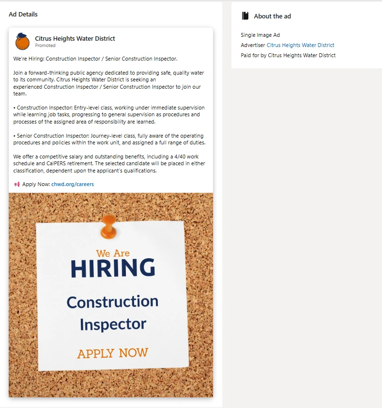 The ad from Citrus Heights Water District targets candidates for either an entry-level or journey-level Construction Inspector position, offering a clear distinction between the two classifications. The copy effectively outlines the structure of responsibilities for each level, giving potential applicants a sense of progression and fit based on experience. The ad also provides a brief but informative summary of the benefits package, highlighting work schedule flexibility and retirement planning. While the tone is community-centered and straightforward, the design remains simple, using a corkboard graphic to underscore the hiring message. However, the post might benefit from stronger visual branding and more detailed information about the work environment or organizational culture.