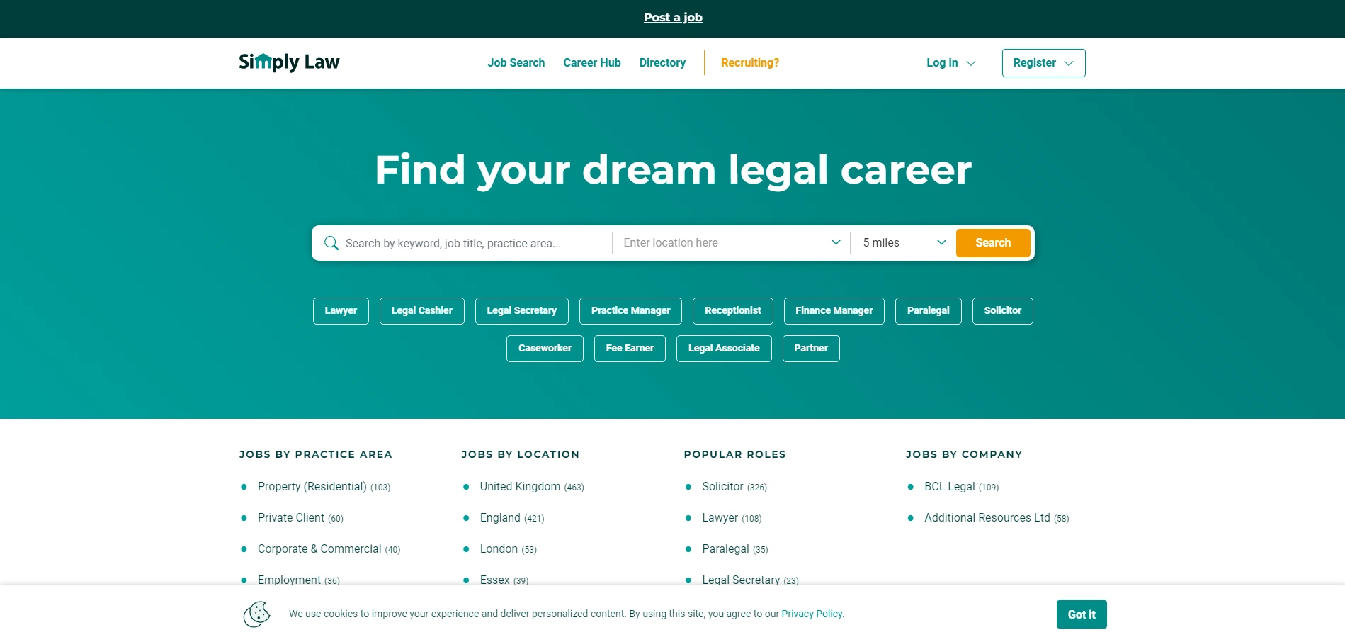 SimplyLawJobs is a UK-based job board specifically tailored to legal professionals, offering a wide variety of legal job postings across various practice areas, including family law, commercial law, and litigation. The site is known for its user-friendly interface, allowing recruiters to filter job searches by location, practice area, and experience level. SimplyLawJobs caters to a range of legal positions, from entry-level roles to senior legal counsel, and is ideal for recruiters seeking candidates within the UK legal market. It also provides a platform for law firms and in-house legal departments to advertise job openings to a targeted audience of legal professionals.