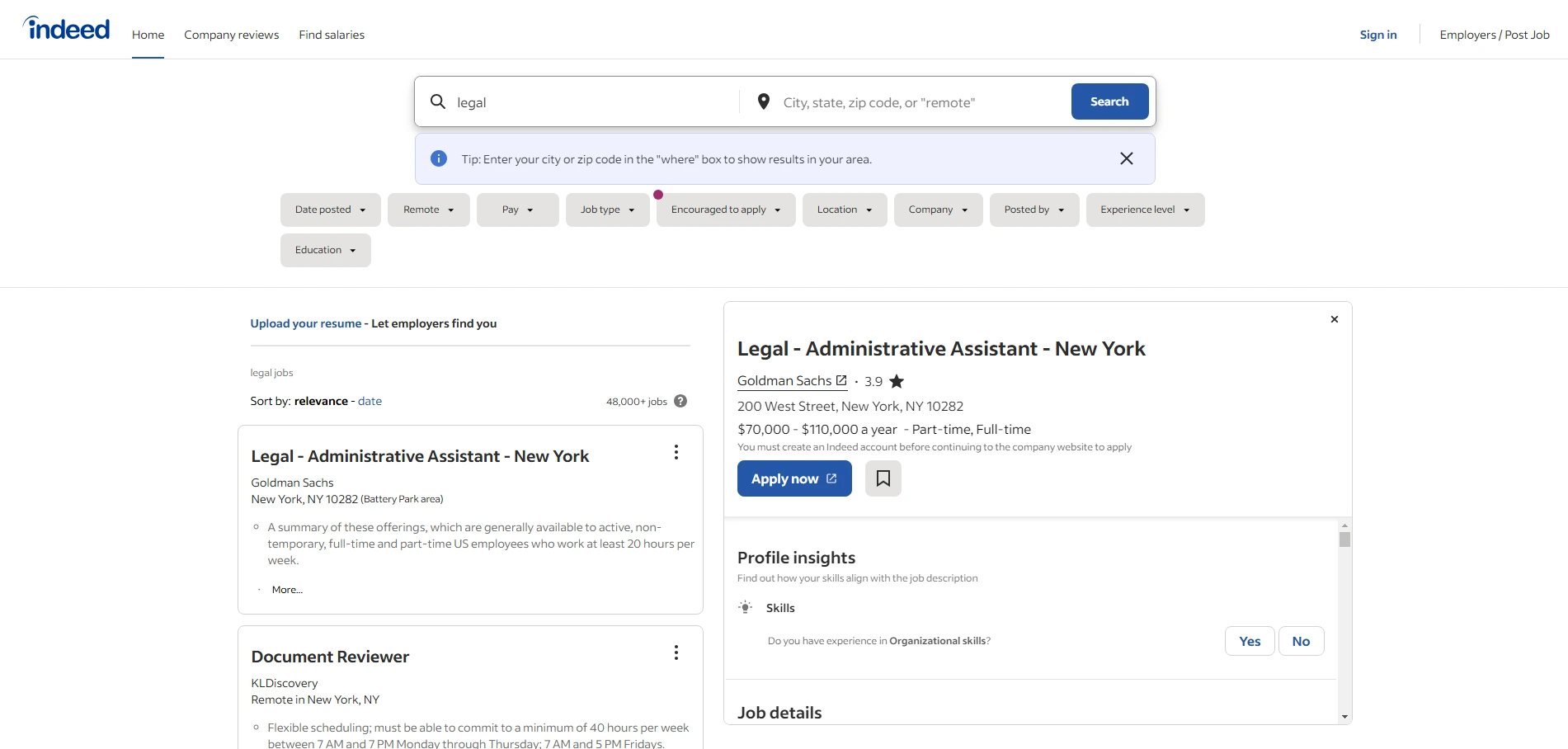 Indeed is one of the largest job search engines worldwide, and its legal job section is vast, covering everything from entry-level roles to senior legal positions. Recruiters can access a wide range of features, including customized job postings, resume searches, and employer reviews. The platform allows legal recruiters to target specific practice areas, locations, and experience levels, helping them connect with potential candidates across various industries, including private law firms, in-house corporate departments, and public sector agencies.