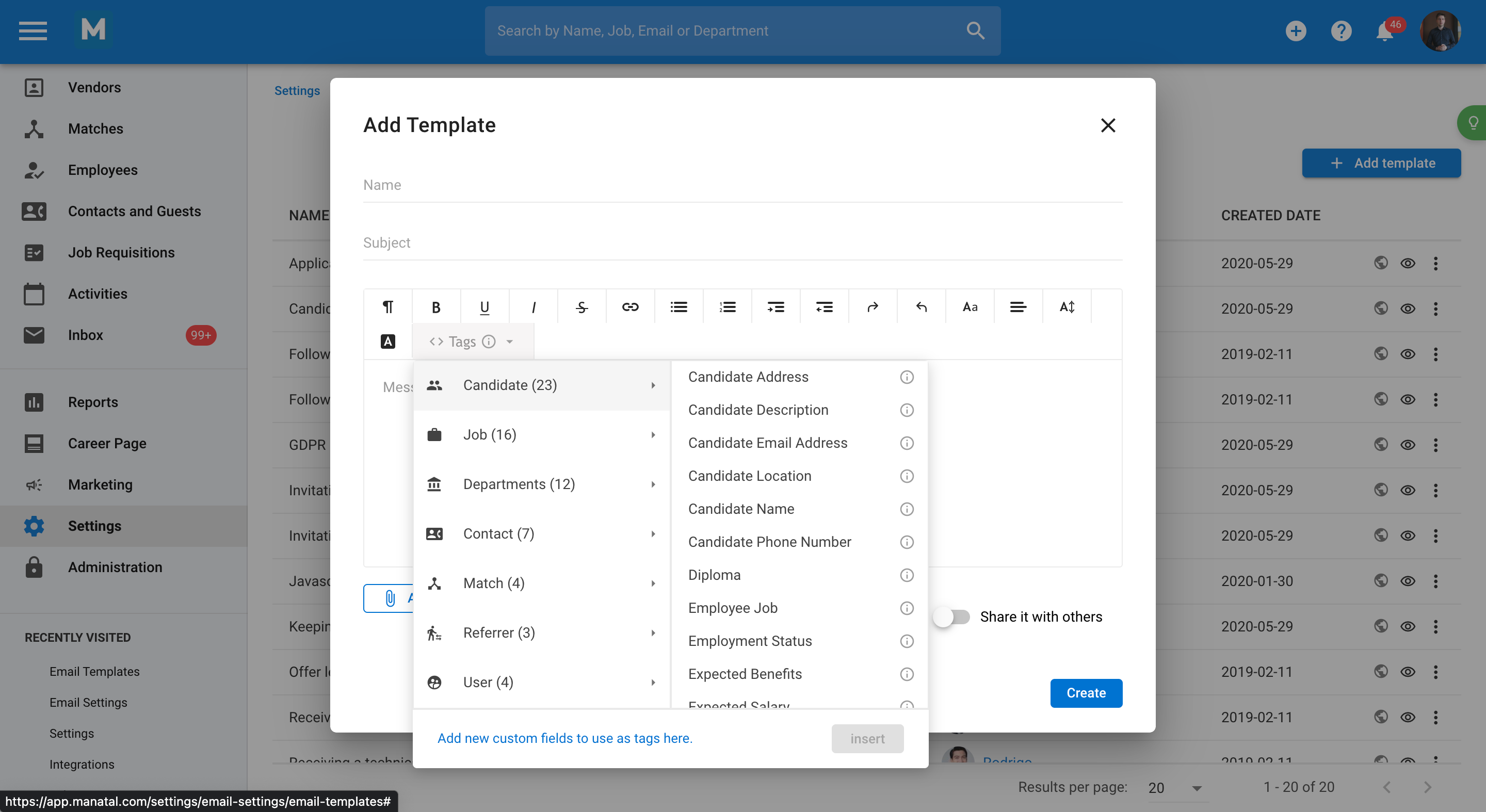 You can use any native or custom field in your account as an email tag, giving you more flexibility and customization options for your email templates. For example, you can use a custom field to insert a unique code, a link, or a rating for each candidate.