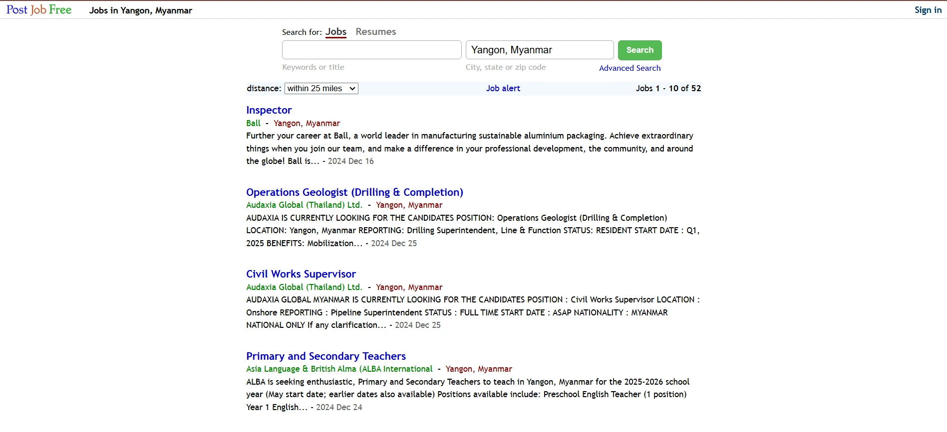 PostJobFree is a straightforward and cost-effective platform for finding talent in Myanmar, particularly in Yangon and its surrounding areas. It allows employers to post job openings for free, making it an accessible option for businesses of all sizes. The platform’s simplicity is its strength, offering easy navigation for both recruiters and job seekers. With its searchable database of resumes, PostJobFree enables recruiters to find candidates who match their requirements proactively. Whether you’re looking to fill entry-level positions or specialized roles, PostJobFree provides a practical solution to connect with local talent without incurring high recruitment costs.