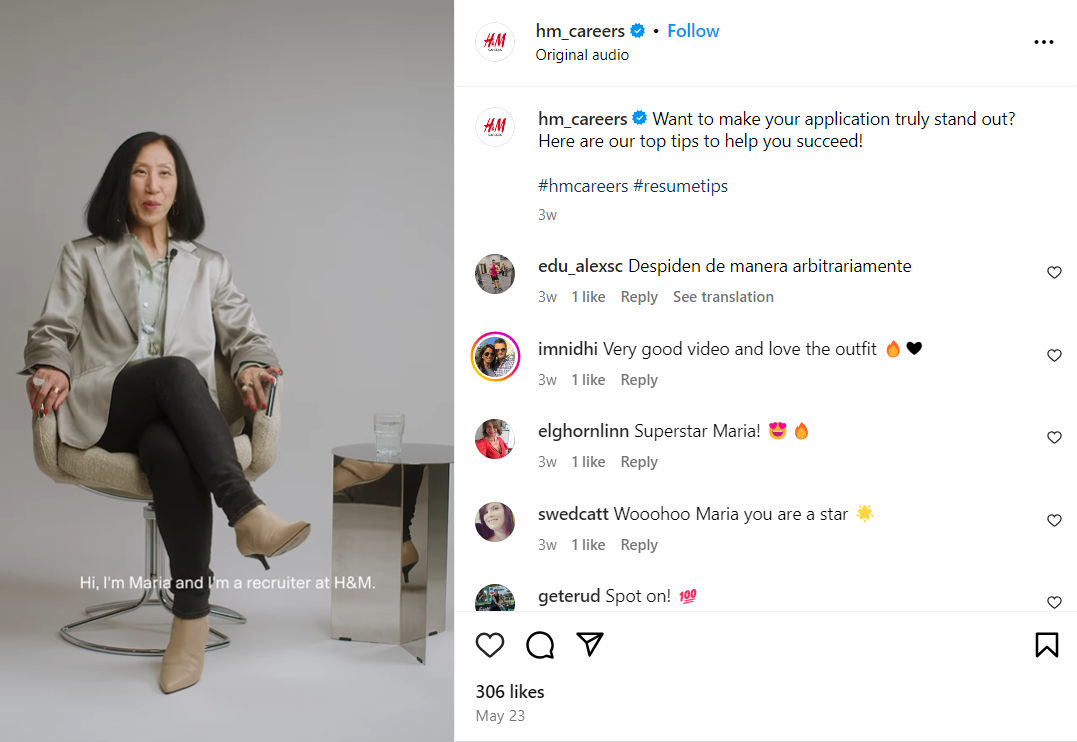 When it comes to applying for a job, everybody needs some tips and tricks to boost their likelihood of securing that empty seat. H&M lets job seekers out there know that the company is all about supporting its candidates right from the first stage. The global fast fashion brand constantly posts videos about secrets to successfully being hired. In this particular Instagram post, its recruiter points out how you can make your application stand out. Talk about showcasing a solid employer brand right from the get-go.